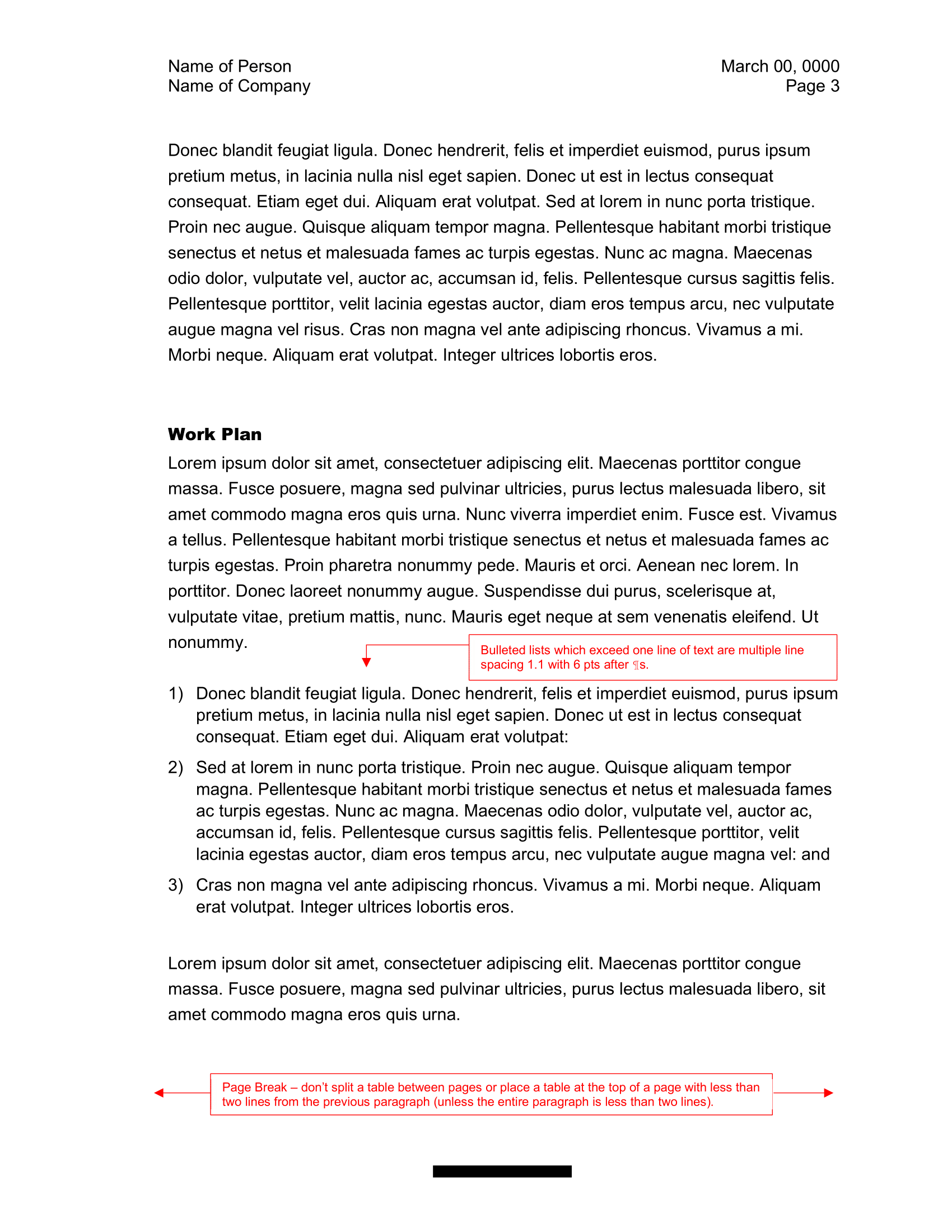 This document is an example of the internal formatting and style guidelines I developed and maintained. It provides a detailed reference for proposal and report consistency, covering everything from font and spacing rules to bulleted lists, tables, signature blocks, and attachment handling.